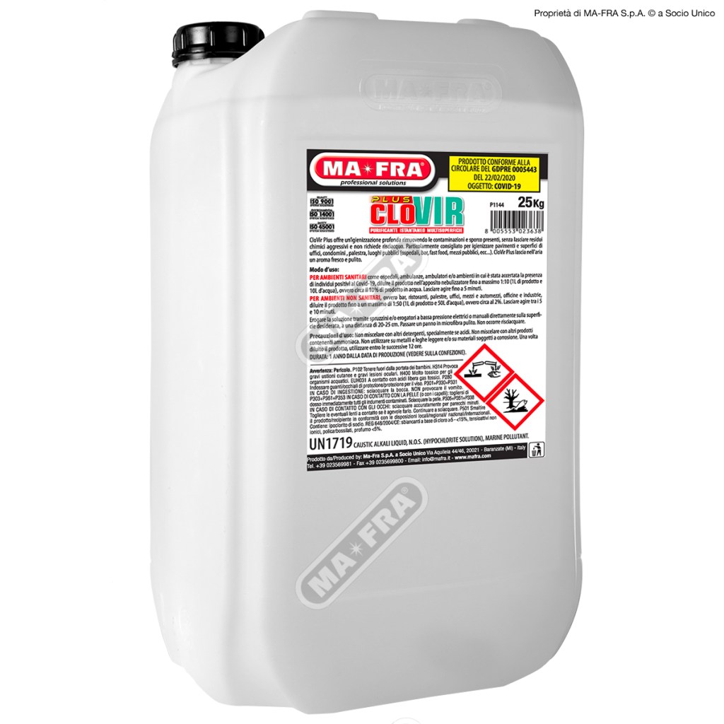 CLOVIR PLUS è un purificante concentrato istantaneo multisuperficie che offre un’igienizzazione profonda rimuovendo le contaminazioni e lo sporco presenti, senza lasciare residui chimici aggressivi e non richiede risciacquo.