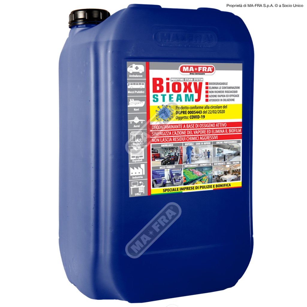BIOXY STEAM è un decontaminante liquido, a base di un compound di perossidi sviluppato da Mafra, adatto per l’utilizzo in sistemi a vapore con caldaia in acciaio tipo GEYSER.